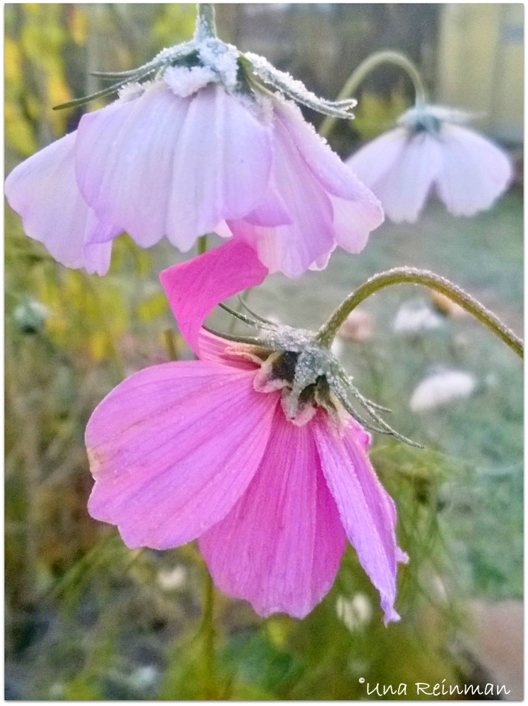 Ensimmäinen pakkasyö oli täälläkin. Aamulla piti heti mennä kuvaamaan huurteisia kasveja. Pakastemansikoita meillä ei sentään ollut.